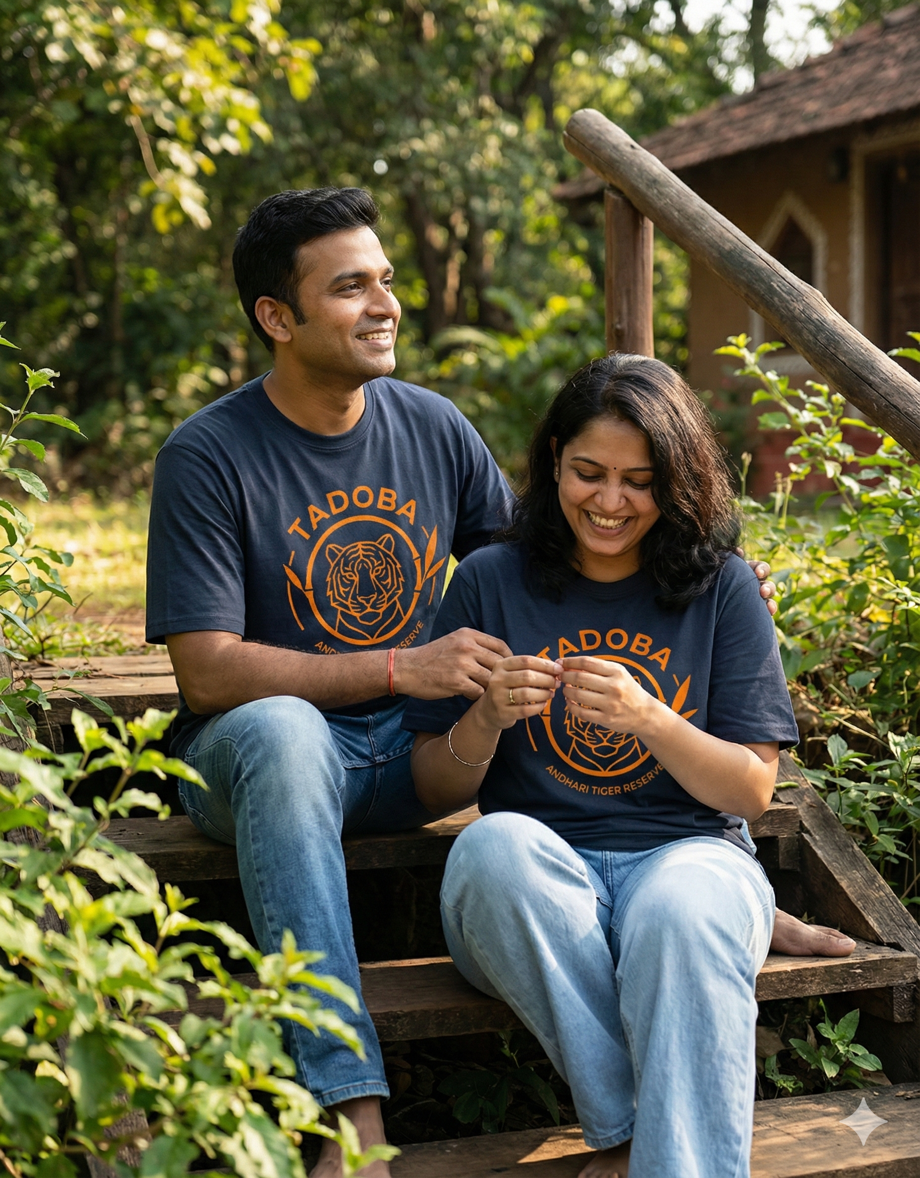Carry the spirit of the jungle wherever you go. This exclusive tee pays homage to the majestic Royal Bengal Tigers of Tadoba Andhari, the "Jewel of Vidarbha." Featuring a striking geometric tiger emblem framed by native bamboo motifs, the bold orange print pops against the deep navy fabric, symbolizing the fiery spirit of the tiger in the dark of the forest.